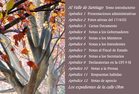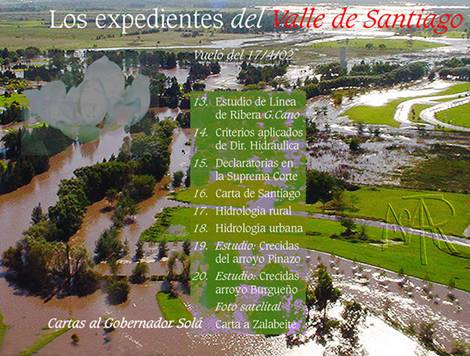 http://www.delriolujan.com.ar/al%20valle%20de%20Santiago.pdf http://www.delriolujan.com.ar/Santiago%20apendice%201.pdfhttp://www.delriolujan.com.ar/Santiago%20Apendice%202.pdf http://www.delriolujan.com.ar/Santiago_Apendice_3_ne.pdf http://www.delriolujan.com.ar/Santiago_Apendice_4.pdf http://www.delriolujan.com.ar/Santiago_Apendice_5.pdf http://www.delriolujan.com.ar/Santiago%20Apendice%206.pdf http://www.delriolujan.com.ar/Santiago%20Apendice%207.pdf http://www.delriolujan.com.ar/Santiago%20Apendice%208.pdf http://www.delriolujan.com.ar/Santiago%20Apendice%209.pdf http://www.delriolujan.com.ar/Santiago%20Apendice%2010.pdf http://www.delriolujan.com.ar/Santiago%20Apendice%2011.pdf http://www.delriolujan.com.ar/Santiago%20Apendice%2012.pdf http://www.delriolujan.com.ar/losexpedientesdelacalleOhm.pdf Apéndice 13, Resumen del "Estudio de Línea de Ribera"; extenso trabajo realizado por el Dr. Guillermo J. Cano y 11 colaboradores, a solicitud del Consejo Federal de Inversiones en 1988. Análisis, conclusiones y una evaluación de funcionarios completan este trabajo . http://www.delriolujan.com.ar/Santiago%20apendice%2013.pdf En el Apéndice 14 se alcanza mirada a dos pequeños cuerpos legales ambientales que tallan en estas materias; y a sus luces, los insustentables criterios de la Dirección Provincial de Hidráulica . http://www.delriolujan.com.ar/Santiago%20apendice%2014.pdf Ya hemos solicitado el “pronto despacho” para obtener vistas de esos estudios hidrológicos y sus resoluciones. Pues con ellas incorporaremos nutrida y precisa información; tal vez un día, suficiente para ajustar arbitrios y criterios. y critica la sustentabilidad administrativa, legal y técnica de la Dirección de Hidráulica, así como de la Autoridad del Agua; acercando ejemplo concreto, denunciando sus malogradas sustentabilidades . http://www.delriolujan.com.ar/Santiago%20Apendice%2017.pdf El enfoque final apunta a resaltar las diferencias básicas a considerar en hidrología rural y en hidrología urbana. Un Anexo final aporta discernimiento de criterios legales y técnicos sugiriendo ajustes en jurisprudencia y homologación de procedimientos técnicos en la modelación hidrológica y en la demarcación de líneas de ribera de creciente máxima histórica para las áreas destinadas a creación o ampliación de núcleos urbanos. El Apéndice 20 completa al anterior con el “Estudio de Crecidas del arroyo Burgueño”. En ambos casos, la modelación hidrológica vuelca sus resultados finales en una profusa cartografía con archivos de buena resolución de imagen. http://www.delriolujan.com.ar/Santiago_Apendice_20.pdf Cierran esta página, un archivo JPEG de 4 M de resolución, con una fotografía satelital del Valle de Santiago que incluye altimetrías del IGM, división de cuencas, corrida de caudales, bandas de anegamiento y localización de los barrios cerrados comprometidos en el valle de inundación. http://www.delriolujan.com.ar/PilarSat%20altim%20aneg%20barrios.jpg Documentación nunca elaborada por estos municipios, ni por la Dirección de Hidráulica Provincial, a pesar de su imprescindible carácter y su trascendencia ambiental, cultural, económica y social. Y una muy extensa de las muchas cartas doc al Gobernador Solá http://www.delriolujan.com.ar/carta%20doc%20al%20gobernador.pdf http://www.delriolujan.com.ar/EVS_noved2.html http://www.delriolujan.com.ar/EVS_SCorte.html