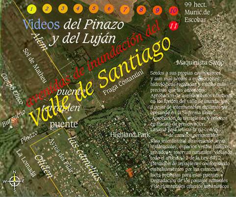 30 . . Cuenca Pinazo-Burgueño . Inicio de estudios 6/11/1996 Frutos: “Los expedientes del Valle de Santiago”: 1 . 2 . 3 . 4 . 5 . 6 Barrios cerrados asentados en avenidas de inundación… Política ambiental en los Municipios de Pilar y Escobar Respetos municipales a las franjas de 100 m mínimos inexcusables destinados a la conservación de los desagües naturales, establecidos por la Ley 6253/60 y su Decreto Reglamentario 11368/61; y respetos provinciales a las franjas de cesión hasta 50 m más allá de la línea de ribera de creciente máxima, toda vez que un propietario rural propiciare la creación o ampliación de un "núcleo urbano", según lo establecido en el Art. 59 de la Ley 10128/83, convalidado por el Art. 4° de la Disposición 984/00 del MOSPBA y refrendado por el Decreto 37/03 del Gobernador Solá (Bol. Ofic. 24900). Cinco fueron originalmente los barrios cerrados cuyas tramitaciones denunciara: Los Sauces; Los Pilares; La Lomada del Pilar; Ayres del Pilar y Street Pilar. Todos ellos en su inmediata vecindad y en el Municipio de Pilar. Ahora se suman Campo Grande, en este mismo municipio; y Campo Chico y Sol de Matheu en el vecino municipio de Escobar. Tras 8 años de trabajo, se compilaron y editaron en el capítulo 1°, las denuncias administrativas y judiciales; El 2° capítulo acerca desarrollos de criterios hidrológicos y las primeras presentaciones en la Suprema Corte Provincial; a la par de documentos al Gobernador y al Sec.Ing. Zalabeite, de los dos últimos años. El capítulo 3° nos alcanza las "Novedades" de entonces “Perforando la pirámide burocrática en el lenguaje más horizontal”, así, al decir de Francis Fukuyama, hube de construir con total desinterés personal y perseverancia, esta solitaria e interminable denuncia administrativa; en 23 expedientes, que a lo largo de ocho años y medio conformaron un botón de muestra de su laxitud y falta de pasión para el bien común, tanto público, como privado o semiprivado. La denuncia penal probó que las Fiscalías han sido atacadas por el mismo virus. 15.000 documentos entregados en mano, con vistas adicionales a 35 personas físicas y jurídicas, para sentir que aun en soledad puede renovarse vivo el ánimo que cada mañana en sutiles vigilias nos desvela. No me referiré sólo a las lluvias. Sino en particular, a los diluvios de necesidades originarias de tantas divinas imperfecciones humanas; y a las montañas de papeles con que hube perseguido esta ilusión de hacer algo por un sueño; que como todo sueño llama y necesita construcción. A todas las criaturas que hube en tales reiteradas circunstancias conocido, reconocido y finalmente denunciado, trataré de recordar con mi mayor consideración, comprensión y discreción. Para que ellas tengan siempre su oportunidad de corrección; si es que acaso correspondiera oportuno, a los deseos del espíritu en sus almas. El presente trabajo apunta a inscribir la Naturaleza en la más inmediata cercanía de las poblaciones agrupadas; favoreciendo el sostén de las semiagrupadas y premiando a las dispersas; en aras de volver a depositar y rescatar de los suelos los erarios de identidad que siempre tuvieron. Considerando para ello, puntos de apoyo en las Leyes de Ordenamiento Territorial y Uso del Suelo, cual es el caso de los Decretos Leyes 8912/77 y 10128/83, ordenados por Decreto 3389/87; en la Provincia de Buenos Aires, nuestra legislación.