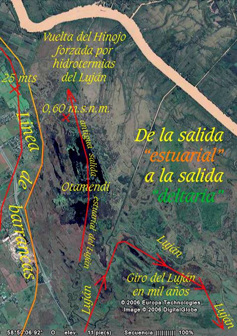 Si somos capaces de imaginar el frente deltario del Paraná retirado hasta la altura de Campana, lograremos advertir que la cuenca del Reconquista tenía su propio delta y por ello contaba con un abanico de salidas que gradualmente fueron muriendo por avances sedimentarios en la llamada planicie intermareal. La hoy llamada salida del “Aliviador”, fue desarrollada siguiendo los estímulos de aquellas antiguas salidas, que aprovechaban las atracciones advectivas de las hidrotermias estuariales para hacer su salida por los prolijos y extensos cordones litorales en dirección NO. Todo eso desapareció y el Aliviador no cuenta desde que se creó con ninguno de esos recursos.