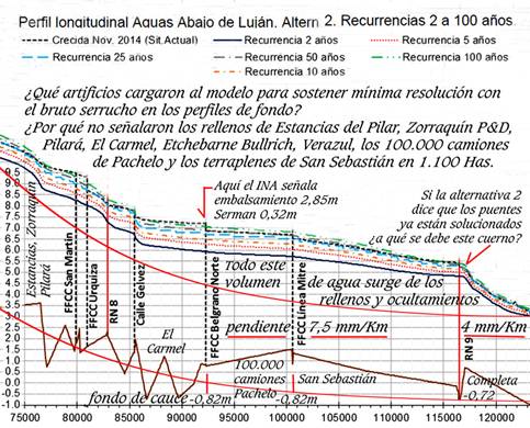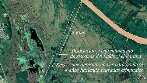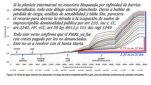 Respuesta a un editorial de La Nación del 8/3/10: Sr Editor, si hay un municipio cargado de ONGs infiltradas por mercaderes de suelos, ese es el Tigre. Sus resultados Ud mismo los señala. Por supuesto, la contribución del grupito O’Reilly, Massa, Scioli es fundamental. Respecto del Aliviador del Reconquista siguen prometiendo soluciones imposibles. El plan MINFRA del que habla la SSUyV jamás mira los flujos. Sin reconocer los terroríficos problemas de diseño de esa obra producto de la cosmovisión medioeval que cargan los ingenieros hidráulicos respecto del movimiento de las aguas en planicies extremas, es imposible hacer nada; salvo comenzar a expropiar las tierras linderas que median entre el Aliviador y Albanueva, incluyendo el frente de este emprendimiento sobre el Luján, para tratar allí de reparar en algo las energías convectivas que hagan posible atenuar la disociación térmica e hidroquímica que favorezca la salida de esas aguas al Luján. El Luján por su parte, carga no menores desventuras que deberán mirar por una recuperación de sus anchos. Salida Luján 1 . 2 . 3 . 4 . 5 . 6 . 7 . . Aliviador . comireclu ensanche 1 . 2 . 3 . 4 . 5 . 6 . 7 . 8 . 9 . 10 . 11 . 12 . 13 . 14 . 15 . 16 . 17 . 18 . 19 . 20 . CSJ769/20. 500 . 501 . 502 . 503 . 504 . 505 . 506 . 507 . 508 . 509 . 510 . 511 . 512 , 513 . 514 . 515 . 516 . Ver csj769expropia.pdf Los habitantes de la cuenca del Reconquista estuvieron expuestos desde siempre a las sorpresas climáticas: los primeros registros de inundaciones datan del siglo XIX y se continúan hasta el presente. Miran por las inundaciones, pero no enfocan el primer tema a mirar: el equilibrio de las dinámicas de los sistemas ecológicos. La bondad del ministro Simone no habilita cambiar el orden de los 2 primeros enunciados del par 2º, art 6º. Ley 25675. Tampoco la generosidad del BID habilita ignorarlos. Y de hecho, ya lo ha hecho y carga con su irresponsabilidad. Dinámica territorial y población Area aprox de la cuenca 980 Km2 4.239.543 habitantes (9% de la población del país). El crecimiento poblacional en el área fue explosivo y desordenado, siendo Tres de Febrero, General San Martín, Vicente López, San Isidro, Morón, Hurlingham y Tigre los partidos más densamente poblados. En estos, el efecto combinado de la escasa pendiente, los vientos y las lluvias crean las condiciones para las peores inundaciones. El promedio de la población que se encuentra en condiciones de pobreza es de más de un millón de personas. La situación se agrava debido a que parte de estas familias viven en asentamientos precarios -(nada precarios son los barrios cerrados de lujo, que han generado los más inconcebibles crímenes hidrogeológicos e hidrológicos de toda esta región)-, ubicados mayormente en las áreas bajas o inundables, adyacentes a las márgenes del Río Reconquista y sus afluentes, que constituyen justamente parte del rio: su valle de inundación. No es un valle, sino una planicie extrema, que fue ocupada violando durante 60 años las leyes 6253, su decreto reglamentario 11368/61, la ley 6254, el art 2340, inc 4 del CC. el art 59, ley 8912, el art 101, dec 1549, regl. ley 8912 y el art 235 inc C del nuevo CC. Nunca en su historia el COMIREC, la AdA, la DIPSOH, la DPOUyT, la SSRHP, el INA, la FARN, sus pares, o la SCJPBA en donde fueron presentadas 51 causas de hidrología e hidrogeología durante 17 años, dijeron una palabra al respecto de estas violaciones puntuales, probando su capacidad para dispersar de todo horizonte crítico las miradas concretas que deben al 1º de los 4 enunciados del art 6º, par 2º, de la ley 25675, el único que define lo que es un presupuesto mínimo. Aún no lo han hecho. Tampoco en esta convocatoria a audiencia pública virtual dicen o sugieren lo más mínimo que cabría decir al respecto La FARN con su constitucionalista Daniel Sabsay a la cabeza, jamás hizo hincapié en la inutilidad de hablar de la carreta ambiental, si el buey está muerto y en adición, atrás de la carreta.Y no decimos que estuviera muerto desde hace un año, sino desde hace no menos de 60 años cuando las riberas de los cursos que convectan en esta planicie de inundación comenzaron a ser ocupadas sin control municipal, ni provincial DPOUyT, DIPSOH, AdA y Geodesia, que siempre aclaraba en las carátulas de los planos los retiros mínimos de 100 m del art 5º, dec 11368, regl ley 6253. Ya hube señalado en varias causas presentadas en la SCJPBA, que el COMIREC estuvo durante más de una década a cargo de la Arq Mara Anselmi, acompañada de un guitarrista y un asistente adicional, muy buenas personas, que solo cumplían la función de emitir tweets. Así entendían y atendían el debido proceso.Jamás organizaron un proceso ambiental como corresponde, aunque tuvieron la virtud de ir surfeando los inocentes reclamos de las organizaciones ambientales, que reitero, jamás enfocaron el lugar del buey y el de la carreta ambiental y siguen creyendo, que los flujos ordinarios de estos cursos de llanura se mueven por pendientes en los fondos y no por energía solar, que les viene transferida por esteros y bañados aledaños a las pequeñas y grandes sangrías, sin los cuales no hay alimento para el buey solar: 2º enunciado par 2º Ahora quieren hacer cloacas, cuyas plantas de tratamiento volcarán sus desechos en las aguas de un río muerto.Primero tienen que mirar el estado del buey y considerar si ese Aliviador que han fabricado para extender 11,5 km los tutankamónicos regalos del Reconquista, se arreglan con cloacas. Con cloacas se arregla la política dando de beber estos placebos, pero nada de esto resucitará al buey, ni abreviará sus padecimientos y los de los vecinos que no hicieron oportunas observaciones a Ubieto y a Massa y de esa forma ellos también permitieron esas ocupaciones de suelo, que no son en el Tigre y Reconquista, precisamente de familias pobres.Hoy el río Luján no saca por su cauce ni el 1% de sus fl