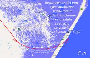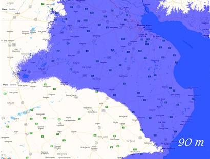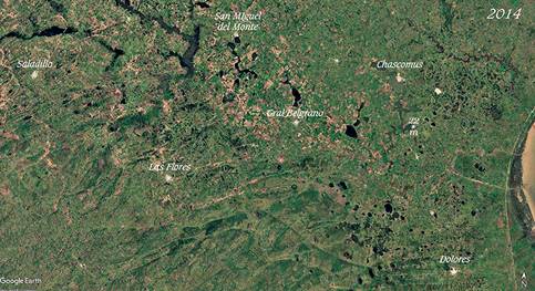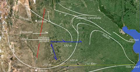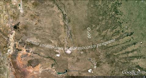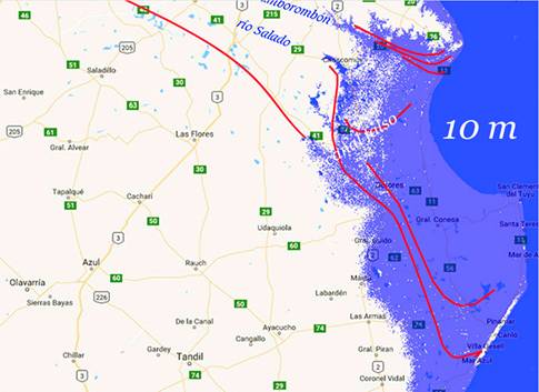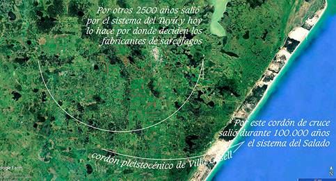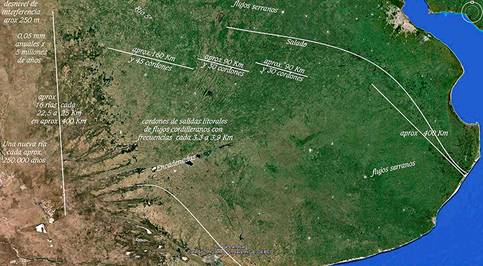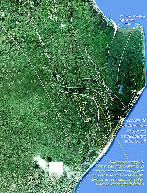 Las imágenes que aún hoy guardan grabadas las dinámicas de los cordones litorales de salidas tributarias en interfaces marinas a lo largo del tardío Mioceno, reconocen comienzo en la actual cota de los 300 m en la longitud 65º O, a 750 Km de distancia de la actual ribera atlántica. No estoy en condiciones de inferir que esa cota fuera la de aquellos tiempos del tardío Mioceno, o fuera fruto del desplazamiento y alzamiento de las placas; o herencia en plenillanura sureña de la fractura de las sierras de San Luis. Basta una elevación de tan sólo media décima de milímetro por año, para en 5 millones de años superar ese desnivel de aprox 250 m que se interpone a las salidas del Oeste en directo a la planicie.Por lo tanto, tampoco infiero que el mar pampeano miocénico hubiera alcanzado esas alturas, o fueron socavados sus accesos para dejar allí grabados esos tránsitos de las formidables rías; y ya en planicies marinas con aguas más someras, los bordados cuspidados de los cordones litorales que siguieron. http://www.alestuariodelplata.com.ar/salado2.html A estos aprecios a las “nacientes” del sistema del Salado cabe le sigan el de las “salientes” al océano, incluídas sequías e inundaciones Sequías 1574-76, 1614-1617, 1700-1710, 1729-1730, 1747-1749, 1771-1773, 1805, 1824 y 1832, 1833, 1879, 1910, 1929-1930, 1950-1952, 1956. Inundaciones. En 1857 un barco a vapor partiendo de Buenos Aires y subiendo por el Salado llega hasta la laguna de Samborombón. Imposible de no haber abierto una canalización. Que por cierto, jamás resolvería la disociación advectiva con las riberas de la bahía Hasta hace 2.500 años el Salado salía por la cara SE del cordón pleistocénico de Villa Gesell, al que se ve como línea delgada ligeramente curvada y cruzada al final de la carta y por cierto, anterior a la formación de las barreras de médanos de hace 2500 años.