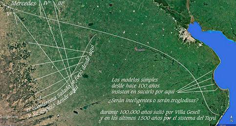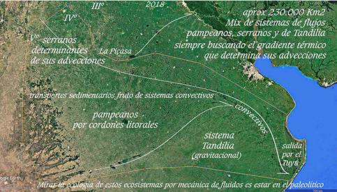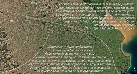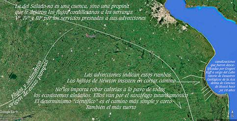 Respecto de esta mentada cuenca del Salado aprecio señalar que nunca fue en los últimos 500.000 años "cuenca", sino "la propina" que le dejaron al Río V por haber oficiado los delicados gradientes térmicos determinantes de las advecciones de los sedimentos y flujos cordilleranos durante al menos los últimos 2,5 millones de años. La expresión "cuenca de sedimentación" ya nos pone en alerta del carácter o aprecio gravitacional que se supone reina en ella. En lugar de estimar cuáles son sus virtudes o aptitudes para estimular las dinámicas de los transportes sedimentarios, los geólogos apuran aprecios a los depósitos. Siempre ha sido así y no será menor el esfuerzo para cambiar de actitud. La caída de la manzana ha quedado rigidizada en su física matemática. Se miran caudales de entrada y de salida y en modelos de caja negra resuelven lo que nunca modelizaron, ni infirieron por fuera de las variables conocidas. Nunca tuvieron presente alguno los sistemas “convectivos” y los determinantes horizontales “advectivos”. Con semejante economía es inevitable que después de 380 años les cueste abrir los ojos a las energías que brotan en Natura. El ligero y gradual plegamiento al Sur de las sierras de San Luis impidiendo la salida Oeste-Este de los flujos cordilleranos de los antepasados del Tunuyán, Diamante, Atuel y tantos que ya borraron sus huellas, obligaron a buscar salidas al Sur por latitud 35º S , longitud 65º 40' O, y a medida que el plegamiento aumentaba y los senos de salida se tapaban seguir descendiendo hasta los 38º S. Este proceso es el responsable, junto a los al Norte comparables de los Río IV y III, de la formación de al menos los últimos 700 m de suelos pampeanos hasta hoy atribuidos al sistema paranaense. Que por ello doy en llamar mar pampeano, dejando las dunas para el recuerdo de los despistes geológicos en postrer olvido. La salida hacia el O, N y NE de los sedimentos y flujos cordilleranos cuyas advecciones fueran suscitadas por los flujos de estos tres cursos serranos, recibió como premio sus correspondientes "propinas", a las que la voz "cuenca" les queda un poco grande. Querer resolver la "personalidad" de estas "cuencas" con créditos del cretácico a 7000 m de profundidad, habla de que el imaginario humano no tiene límites. Tampoco su catecuménica analógica mecánica ceguera.