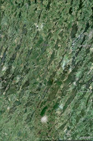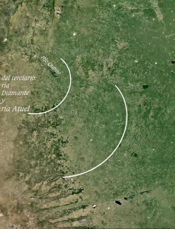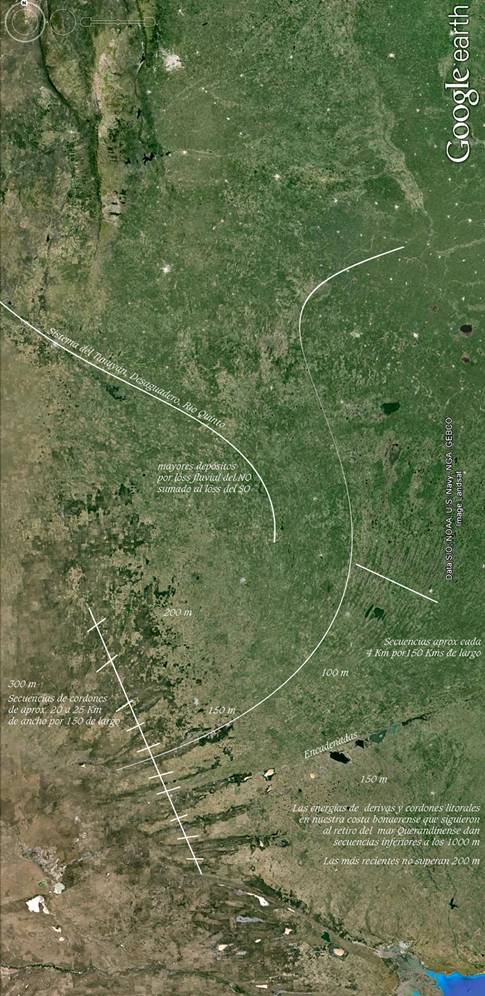 Las ríadas que se advierten a la derecha de la imagen conforman formidables conos de deyección de aportes sedimentarios cordilleranos con registros geomorfológicos que hablan de grandes caudales y energías en un tardío mioceno; con bocas de ingresos en las actuales cotas 300 a 250 m, a las salidas en la interfaz de un mar pampeano miocénico en las actuales cotas de los 200 a 150 m. Estas formidables energías vienen acreditadas por la amplitud de las rías y su persistente reiteración, progradando al Sur en número aprox a los 12 hasta el eje de las Encadenadas y 4 adicionales hasta el eje de la ría de Bahía Blanca. Progadación que responde, reitero, al desarrollo de la fractura terciaria al Sur de las sierras de San Luis, impidiendo que cursos como el Tunuyán, Desaguadero, Diamante y Atuel continuaran oficiando sus descargas en la dirección O-E. marpampeano 1 . 2 . 3 . 4 . 5 . 6 . 7 . 8 . 9 . 10 Rías que aún hoy acercan registros visuales satelitales superlativos, exhibiendo en la longitud aprox a los 66º O y desde los 34º 35' a los 38º S, frecuencias del orden de los 22 a los 25 Kms. y largos que hoy aún descubren 50 Kms en el primero al Norte, hasta 200 Kms en los que le siguen al Sur. La imagen muestra las acreencias que seguían a continuación de estas rías en la interfaz del retiro gradual del mar pampeano miocénico, por generación de cordones litorales de salidas estuariales en un área al O de unos 100 Km de ancho, por 300 Km de largo. Area expresada entre las líneas de la imagen que sigue.