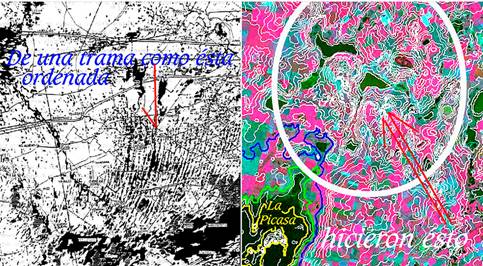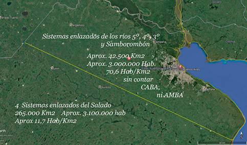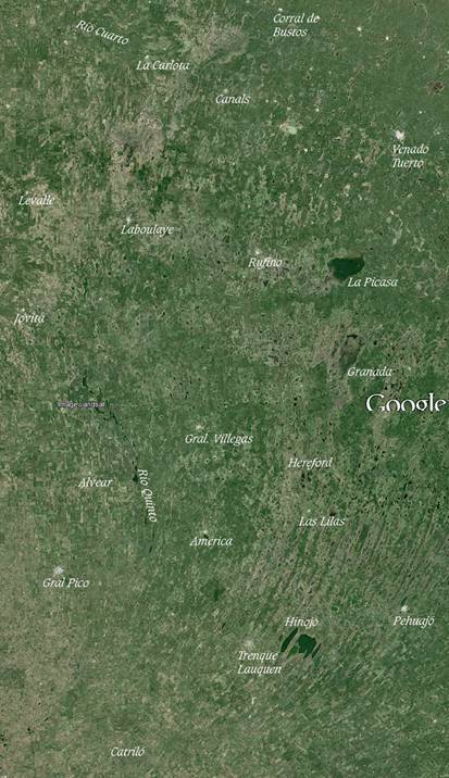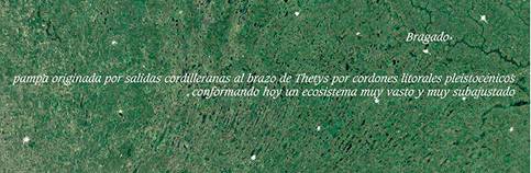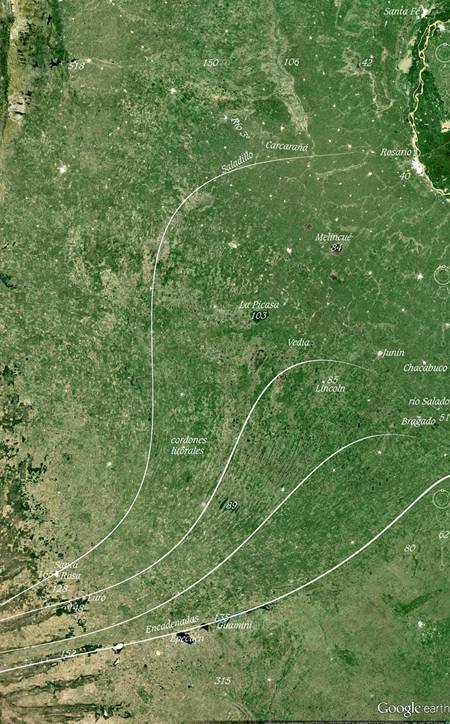 Las imágenes que siguen intentan mostrar las delicadezas de un sistema de compromisos advectivos de tres cursos serranos con las rías de descargas de flujos cordilleranos en cota 360 a 250 m en la longitud aprox a los 66º O y desde los 35º a los 38º S, con frecuencias del orden de 22 a los 25 Kms. y largos que hoy aún descubren 50 Kms en el primero al Norte, hasta 200 Kms en los que le siguen al Sur