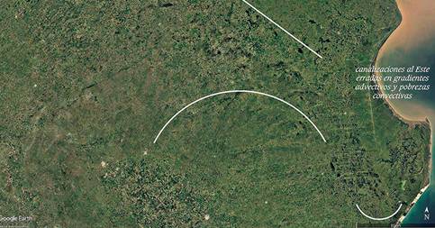 d) a las manifestaciones también correspondientes al retiro gradual del mar paranaense, de una generación de cordones litorales de salidas estuariales que conservan registros hidromorfológicos de sus dinámicas y reiteradas generaciones en huellas muy bien definidas (+ de 30) con frecuencias de 4 a 4,5 Km dando cuenta de las aptitudes de las energías convectivas para el transporte sedimentario