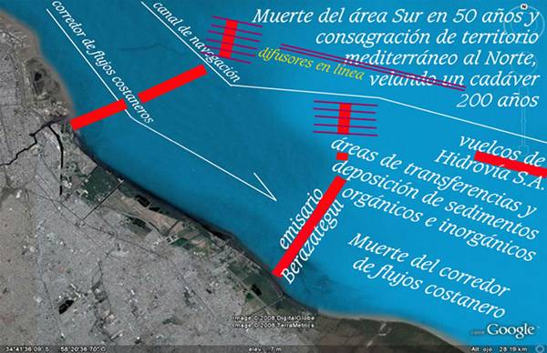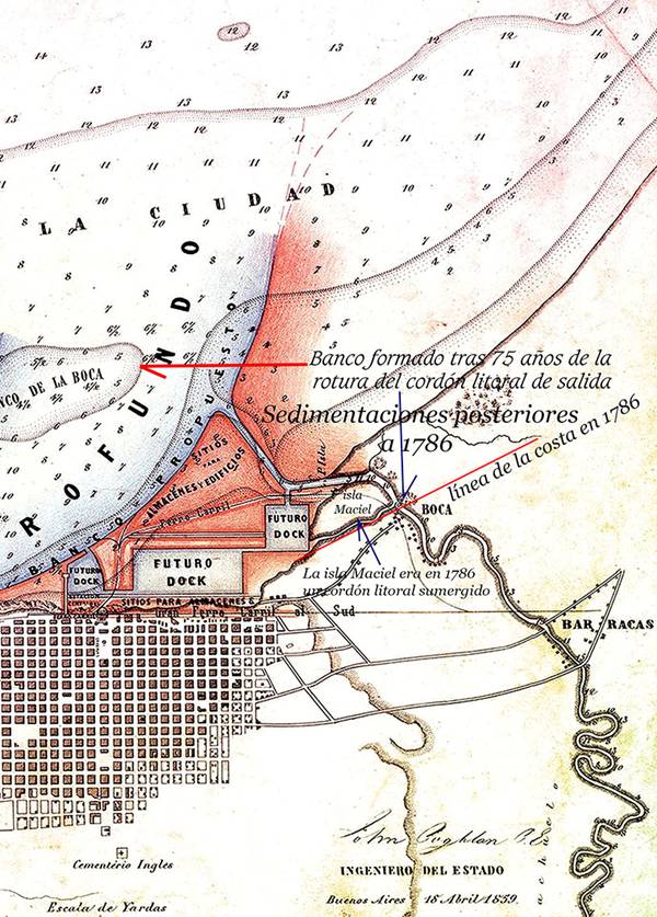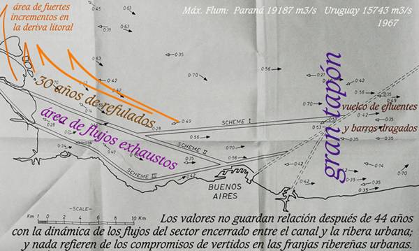 III . Respaldos legales de la Hidrovía Ley 24385/1994, Dec Regl 343/2005, Ley 27419/17, Disp 5/2018, Res 307/2020, Res 33/2021, Res Gral 4940/2021, Dec 427/2021, DNU 556/2021.269.000 caracteres, 135 páginas -y reitero-, sin una sola letra que apunte a las dinámicas de los sistemas ecológicos involucrados en estas aguas y sus riberas. Primer enunciado del par 2º, art 6º, ley 25675. El único que define lo que es un presupuesto mínimo: “Mirar por el equilibrio de las dinámicas de los sistemas ecológicos”, y a seguido: “su capacidad de carga y transferencias de energía”. Bien anteriores a: “los temas generales del ambiente” y sus siempre declamadas “sustentabilidades”. En algún momento esta Excma CSJN tiene que poner orden en este entrevero, antes de pedirle a una inocente Dra Bonetti que les diga cuándo se resolverán estos problemas. La imagen del 20/2/2024 es un regalo del cielo que sólo reclama tener medio ojo abierto. Y en el mejor de los casos preguntarle al Servicio de Hidrografía por qué estas áreas tan críticas tienen información medioeval. Si el SHN está en la luna, qué podrían aportar el Juez Rodríguez, la Dra Bonetti, el Dr Cafferatta, la Dra Monti, para ayudar al Dr Lorenzetti con alguna información de los depósitos sedimentarios. ¿Cuántas horas lleva hacer una batimetría del área y así descartar las fabulas de Serman?. Y si lo que muestra la imagen objeto de esta causa fuera cierto, no esperar que el Juez Rodríguez nos diga cómo sigue el cuento que empezó en Abril de 1786 y ya se ha cobrado más víctimas silenciosas que las ofrendadas en las guerras de la Independencia. No tengo la menor duda que la Dra Monti ignora estos antecedentes. El gráfico que sigue muestra sus desopilantes fabulaciones. Donde dice que hay 8 m, nuestra imagen muestra que hay +0,50 m por encima del nivel 0. ¿Qué lograría hacer el Juez Rodríguez con semejante marco de fabulaciones académicas?, … otra que pedira la Excma CSJN que se haga cargo de estos soportes infernales centenarios. Coghland muestra las enormes sedimentaciones que siguieron a la rotura del cordón De toda esta debacle la “ciencia” hidráulica no ha dicho media palabra. Siguen creyendo en flujos laminares (fabulación pura). Siguen creyendo que la deriva litoral es fruto de una “ola oblicua”. Siguen ignorando la función irremplazable de los cordones litorales de salidas tributarias. Siguen ignorando que las salidas estuariales siempre son aguas arriba, en dirección contraria a los flujos en descenso. El primitivismo del pensiero mecánico es tan “holístico”, que pedirle al Juez Rodríguez, o al Dr Cafferatta, o al Dr Lorenzetti, o al Dr Sabsay, o al Dr Nápoli o al Dr Casanovas que aclaren estos abismos, es pedirle peras al olmo. 350 años llevan los discípulos de Newton en la luna y 20 años lleva este que suscribe serruchando la tapa de su tumba, sin que una sola voz haya dicho media palabra en pro o en contra de estos diferendos. No existen en un estuario los flujos laminares. Sólo los flujos convectivos y sus determinantes advectivos. Si el Dr Lorenzetti quiere seguir en planicies extremas aferrado a catecismos newtonianos, cabe que se ahorre de pedirle a la Dra Bonetti que diga cuándo cumplirán con el mandato de la causa Mendoza. Ningún mandato supera errores de conocimiento y criterios centenarios tan elementales. Recuerdo las confesiones de Sir James Lighthill antecesor de Stephen Hawking en la cátedra de matemática lucasiana en Cambridge respecto de los errores de la mecánica newtoniana que venían siendo advertidos desde la década del 60 y las confirmaciones del premio nóbel Prigogine alertando que nunca antes en la historia de la ciencia se había abierto un abismo confesional tan grande. El silencio que siguió no hace otra cosa que aumentar el ruido de los desastres que hasta un burro como este que suscribe no cesa de denunciar en Cortes Supremas desde hace 19 años: 51 causas en SCJPBA y 22 en CSJN. 18.000 págs. Por supuesto, la Justicia no está en condiciones de abordar estos temas. Pero no dudo les interesa. El otro día un secretario de demandas originarias de la Corte me escribió: “Francisco, se lo extraña”. Había dejado de hacer presentaciones en provincia. A los pocos meses tenía 4 causas nuevas.Tal vez, si la Dra. Monti me enviara aprecios comparables, seguiría ayudándola después de muerto.