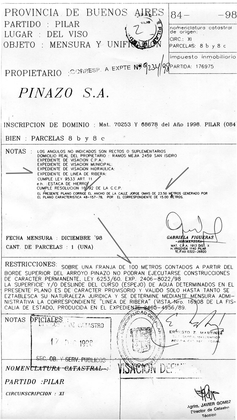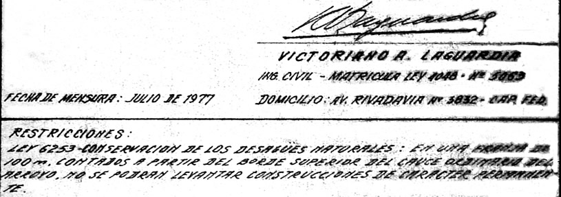 Traer a colación ese plano de PH y dejar de mencionar estos otros que aquí acerco y que aunque pertenecen al barrio la Lomada, nos acercan esa información que Basile niega, prueban que este funcionario miente o aprecia estar en la luna. Tan en la luna como cuando dice que la Dirección provincial de Hidráulica legisla en materia hídrica. Pero veamos cómo en la carátula de estos 2 planos, tanto en el de 1977 como en el de 1998, aparece inscripta la restricción al dominio de los 100 m mínimos e inexcusables que hasta 1995 figuró en todos los planos de la Dirección de Geodesia Provincial.