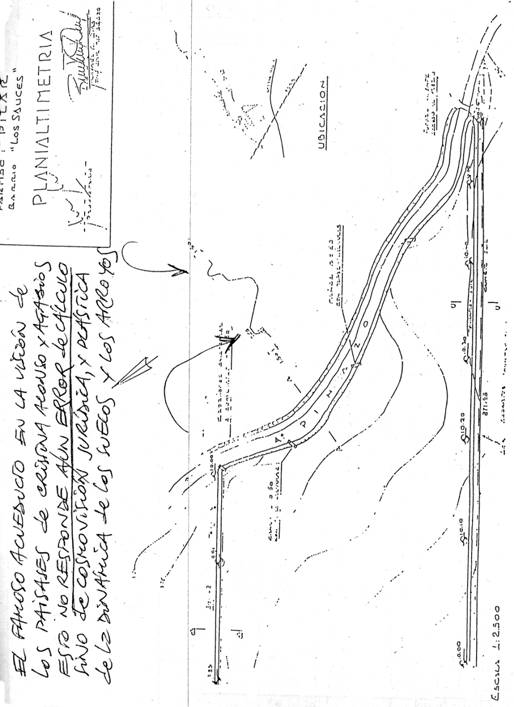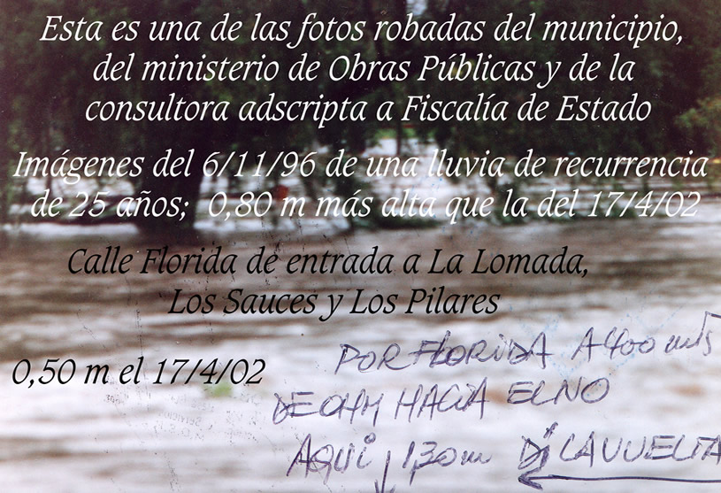 Este plano de 1998 aparece firmado por Gabriela Figueras, esposa del pícaro Sergio Rodoni que tramitara la documentación del barrio Los Sauces con las torpezas que nunca conseguirá borrar de mi memoria y que hasta el año 2009 seguiría reiterando en esa misma Jefatura de inscripción de propiedad horizontal, Ministerio de Economía. Los resultados de esas vivezas están a la vista en esta imagen que fuera publicada en la pág 16 de la Nación a 1/3 de página y a todo color del día 18 de Abril del 2002, tras subir éste que suscribe a un helicóptero para regalarle al que iba en jet a Olivos. la prueba de lo que a él y a su arquitecto les había anticipado 3 años antes les sucedería.