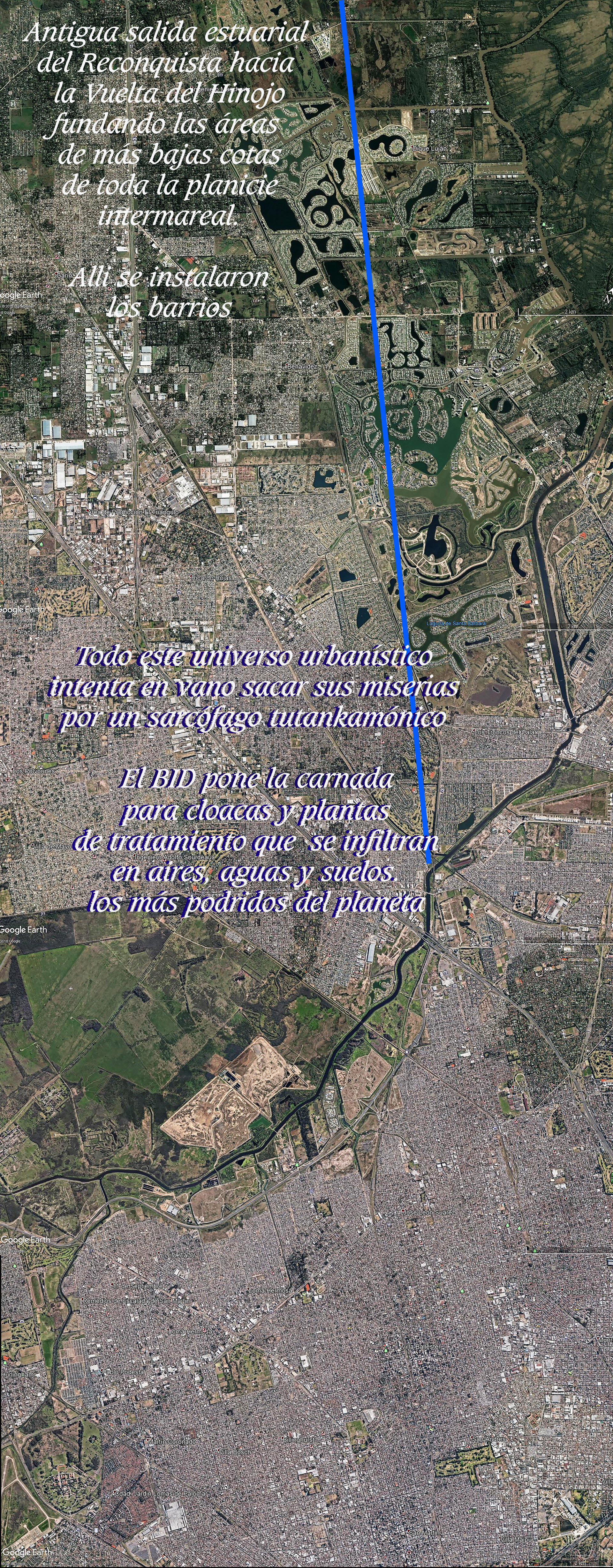 No imagino en otro lugar del planeta una suma de crímenes hidrogeológicos (art 200 CPN) tan descabellada y suicida como la iniciada por Ubieto con Nordelta y seguida por Massa con EIDICO. Si a ésto le sumamos los crímenes hidrológicos (art 240 bis CFPM) liquidando a todos los humedales, las riberas y los propios cauces asistentes de las dinámicas de todos los tributarios urbanos del Oeste -Luján incluído-, sin sacar una gota de agua al estuario que no sea por el freático, pampeano y Puelches, ya tenemos consagrado el reino de polución más diabólico encarnado en Madre natura, que ni el obispo de Roma sabría resolver. Sin embargo, creen que con un sobrino del vocero papal en los más altos cargos ésto se sostiene. Mail de una sicóloga madura del 19/8/2016 refiriendo de las enfermedades que pululan en estos barrios cerrados: Hay una epidemia de enfermedades crónicas no declarada, dentro de las posibles causas pueden haber relación con la ingesta de agua de red contaminada con nano partículas tóxicas, que no son detectadas por la falta de controles.