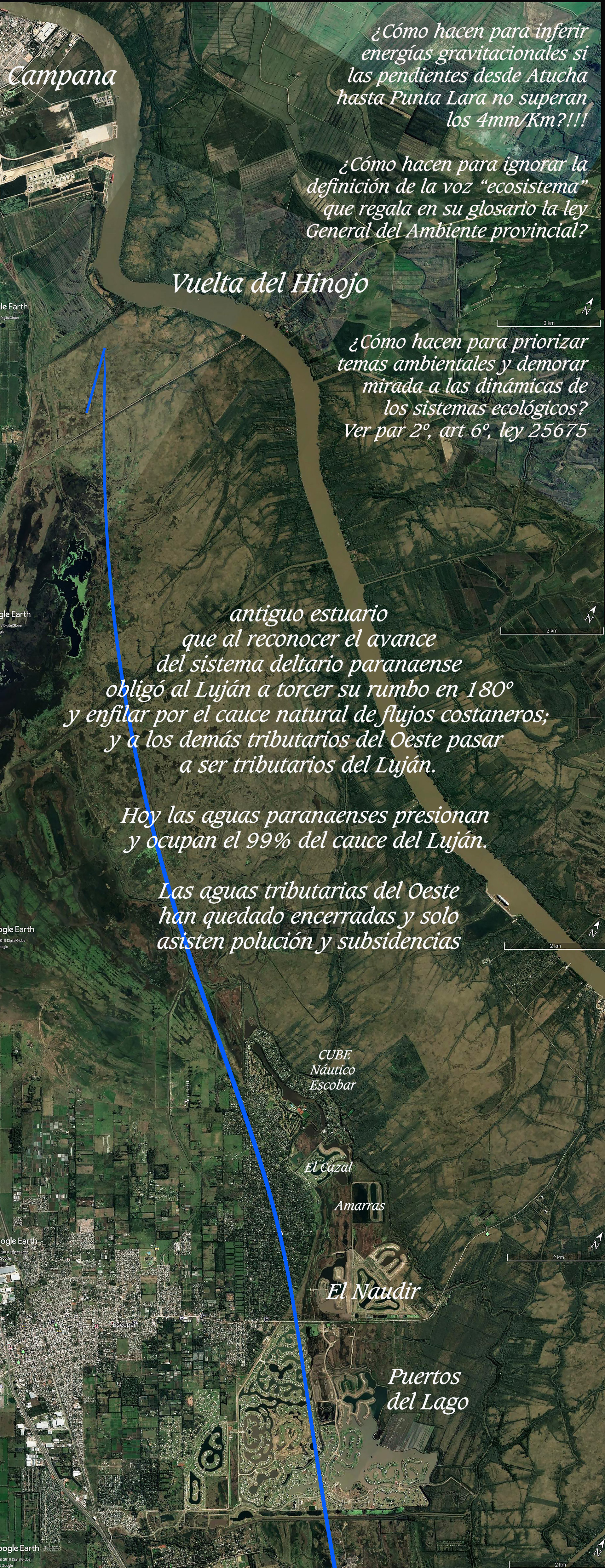 Capítulo V . Si se trata de una zona deltaica identificada como tal en las normas de zonificación aplicables. A estos recursos dialécticos de un Dante que distan años luz de ser probados, profundos y sinceros hube de responder con esta carta Doc: Del Viso, 9/11/2018. Estimado Procurador Julio M. Conte Grand, después de 22 años de trabajo en temas de hidrología e hidrogeología en brazos interdeltarios y planicies intermareales y advirtiendo que los criterios básicos de la ciencia hidráulica estiman reconocer energías gravitacionales en las dinámicas ordinarias de estos cuerpos de agua en lugar de termodinámicas propias de sistemas naturales abiertos y enlazados, hube generado en ámbitos judiciales 76 causas en los últimos 18 años con no menos de 20 millones de caracteres para hoy reconocer que los esfuerzos y los años me van pesando. En estos límites vitales y en reconocimiento de su nivel de conciencia y valentía aprecio acercar estas cartas documento que tal vez ayuden desde su esfera a poner freno a la seguidilla de aberraciones administrativas que como saldo del paso de Dante Galeazzi por la DPOUyT van hoy saliendo a la luz. El 1/11/2019 salieron publicados en el BO 2 resoluciones del OPDS: a) la Res 470/2018 introduciendo las directivas de un nuevo informe de prefactibilidad, acordando interacciones entre la DPOUyT, el OPDS, la AdA y los municipios y así sustituyendo la DIA que por Anexo II, Punto Iincs 7º y 8º de la ley 11723siempre fue de obligada atención del OPDS y respuesta final a los debidos procesos ambientales dispuestos por la ley general del ambiente de la Nación. En esta Res 470/2019 se advierte la gruesa falta de experiencia para redactar reglamentaciones, en este caso, dibujadas como si fueran circuitos electrónicos, que ajenos a toda austeridad y mínima experiencia pudieran acreditar alguna legalidad. El PDF 1540920622912_IF-2018-25739342-GDEBA-OPDS registra estas novedades. b) El enredo dibujado que se dice “exploratorio” del cambio de uso del suelo aparece sostenido por un sistema de información geográfica de ordenamiento ambiental territorial (SIG-OAT) que viene dispuesto en la modificación de la Res 562/2017, tras haber avanzado en previa palmaria ilegalidad modificando el art 9º de los considerandos y el 3º de la Res 29/09, para ahora imaginarla aggionarda mediante el soporte de este SIG-OAT que patentiza su pobreza al no acercar cotas, que ya las cartas de altimetrías del Ejército a fines del siglo XIX nos alcanzaban –ver http://www.delriolujan.com.ar/humedalescobar.html -y sin dar noticia de los deslindes dominiales públicos en cuerpos de agua en brazos interdeltarios y planicies intermareales donde en forma interminable se han concretado y se siguen concretando los más aberrantes crímenes hidrológicos e hidrogeológicos, sin que ninguna de las esferas judiciales provinciales se ocupe de considerar denuncias como la de esta ilegalidad palmaria que pesa en la Res 562/2017 respecto de los incs 7º y 8º, Punto I, Anexo II de la ley Gral del ambiente provincial 11723, que en claro pleonasmo fueron rescatados y respetados por la Res 29/09. Ver http://www.hidroensc.com.ar/incorte50.html Prueba del nivel de desatenciones sobre estas DIA de competencia exclusiva del OPDS lo acerca la reciente sentencia de SCJPBA, registro 497 a f 1101 del 17/10/2018 en la causa I 72406, en la que refieren de una AdA, cuando de hecho, la demanda, nunca apuntada a la AdA, fue motivada por la DIA del barrio San Sebastián emitida por el municipio de Pilar y firmada por un veterinario que remplazaba a su jefe en vacaciones. En el punto 3º de la sentencia señalan: “Tratándose de cuestiones no federales -en el caso el actor pretende ocurrir a la vía establecida por el artículo 161 inc. 1º de la Constitución provincial solicitando la declaración de inconstitucionalidad de una resolución administrativa de alcance particular de la Autoridad del Agua de la Prov. de Buenos Aires”. Ver por http://www.hidroensc.com.ar/incorte224.html la demanda de inconstitucionalidad sobre esta jurisprudencia cargada al inc 1º del art 161 CP por causa I 74719. En adición, los estragos hidrogeológicos (art 200 CPN) obrados en San Sebastián descabezando al Puelches resultan de ineludible competencia federal. A mis 77 años no estoy en condiciones físicas de seguir tramitando demandas en SCJPBA que dejan sin atender cuestiones y axiologías tan básicas, errando sus contenidos e ignorando los obligados enlaces entre lo particular y lo general que plantean las ecologías de los ecosistemas, amén de ignorar crímenes hidrológicos (art 420 bis del CFPM) e hidrogeológicos (art 200 CPN) aberrantes e imprescriptibles. . Preguntas básicas: ¿Acaso alguna vez la AdA dejó de emitir resoluciones con carácter precario y revocable? ¿Alguna vez vetóun proyecto en humedales? ¿Alguna vez demarcó deslindes públicos y privados según lo indica el art 2340, punto 4º o art 235 inc C del nuevo CC en brazos interdeltarios y/o planicies intermareales? Nunca jamás. Tampoco el OPDS acercó informe alguno sobre el equilibrio de la dinámica de los sistemas ecológicos de cuerpos de agua de llanura. En la DPOUyT, después del informe lapidario en 1999 de Susana Garay sobre San Sebastián, su par Stancati untó con miel la cuestión para nunca más hablar del tema. Ver este último de la saga de 30 html por http://www.delriolujan.com.ar/sebastian30.html ¿Hay algún humedal clasificado con protecciones?, siendo el caso, que según expresiones del presidente Macri del 2/2/2016. casi la cuarta parte del territorio de la Nación son humedales. ¿Hay algún funcionario o científico del CONICET que haya alertado sobre la función que cumplen los humedales en la dinamización de los flujos ordinarios de los cursos de agua de llanura? ¿hay algún barrio cerrado que asentado en brazos interdeltarios o planicies intermareales haya sido gestionadosin alterar las cotas de nivel c