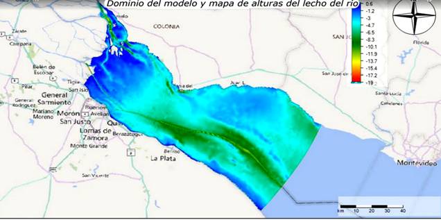 Pag 289 4 MODELACIÓN MATEMÁTICA 4.1 Software Utilizado El movimiento de los fluidos, así como las acciones de estos sobre los sólidos, se describe mediante las bien conocidas ecuaciones de Navier-Stokes. Aplicadas a casos prácticos, estas expresiones no tienen solución analítica debido a su complejidad (ecuaciones diferenciales en derivadas parciales, de orden superior, no lineales), por lo que se recurre a una solución numérica. La implementación se llevó a cabo mediante la Suite Delft3D Flexible Mesh desarrollada por Deltares5 Se compone de varios módulos, agrupados en torno a una interfaz mutuaque permite la interacción entre estos. D-Flow Flexible Mesh (D-Flow FM) es el módulo hidrodinámico (y de transporte) multidimensional (1D, 2D y 3D) que calcula los fenómenos de flujo y transporte no estacionarios en mallas (o grillas) estructuradas y no estructuradas (Ref. 5). El módulo D-Water Quality permite construir modelos de calidad de agua para sistemas de agua dulce, salobre y salina, sobre la base del modelo hidrodinámico preexistente (Ref. 6). 4.2 Dominio y Mallado El dominio del modelo cubre desde la cabecera del Río de la Plata (desembocadura del río Uruguay y Frente del Delta del río Paraná) hasta la línea imaginaria que une Punta Indio- Kiyú, sobre una extensión longitudinal del orden de los 180 km, y lateralmente entre ambas costas (argentina y uruguaya), con un ancho variable del orden de 50 a 80 km (Fig 15). La discretización del dominio se realiza mediante una grilla no estructurada, la cual permite una resolución espacial variable, disminuyendo localmente el tamaño de malla solo donde se requiera mayor detalle, y evitando así no incrementar los tiempos de cálculo. Se utilizó una grilla curvilínea, mayormente compuesta de rectángulos, y para minimizar la difusión numérica se la orientó con el flujo principal del río (producido por las mareas). El tamaño de celda varía de 30 m en la franja costera de la margen Argentina y área de implantación de los emisarios (zona de interés), hasta aproximadamente 500 m en áreas más alejadas (Figura 16).