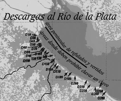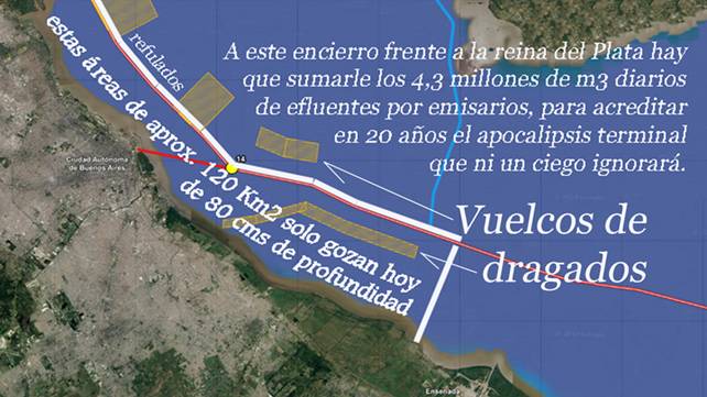 XVI .De las más graves consecuenciasdel emisario de Berazategui Las áreas que median entre el canal de acceso y las riberas urbanas ya han sido afectadas por los vuelcos de dragados al Sur del Km 26. Ya no hay opciones para clavar un clavo. Por estos encierros solo cabe que el emisario de Berazategui alcance a cruzar el canal de acceso y oriente sus bocas difusoras en el mismo eje que llevan los flujos del estuario